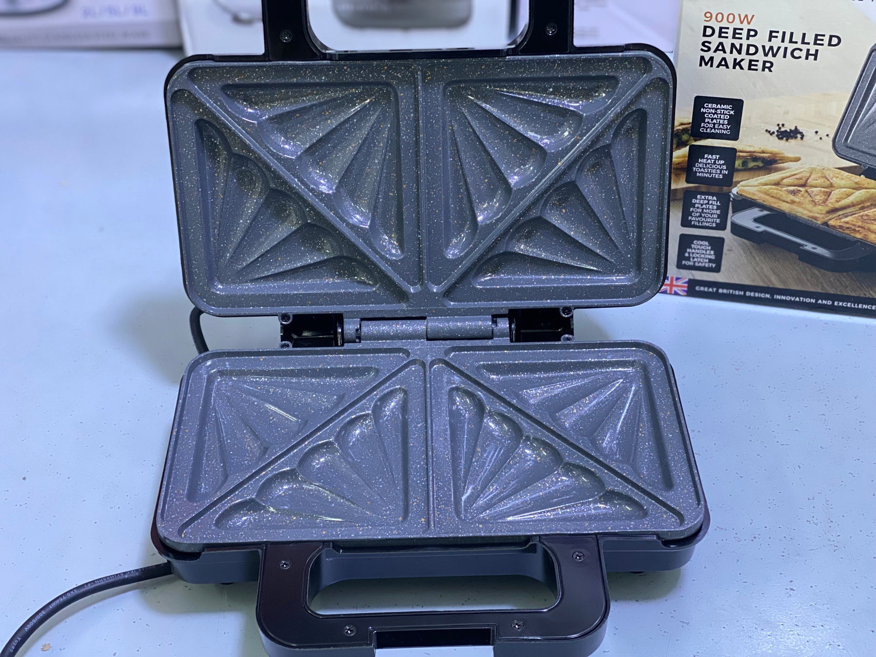 It consumes 900 watt power. It has extra fill plates which are non-stick and easy to clean. It is capable of fast heat up delicious toasties in minutes. It has cool touch handles locking latch for safety. It has stainless steel finishing.